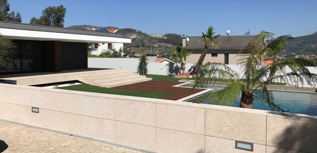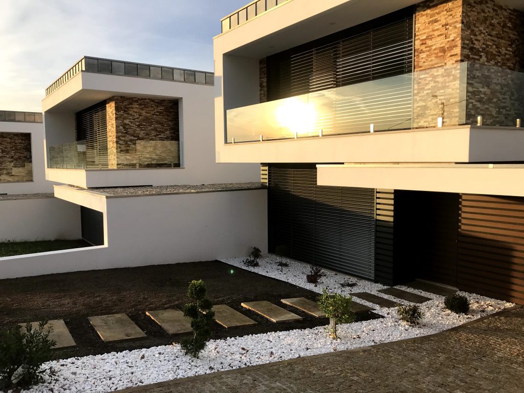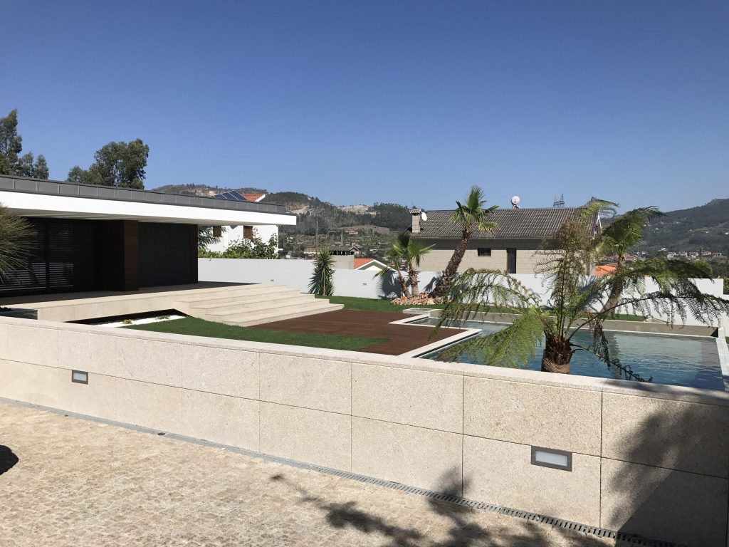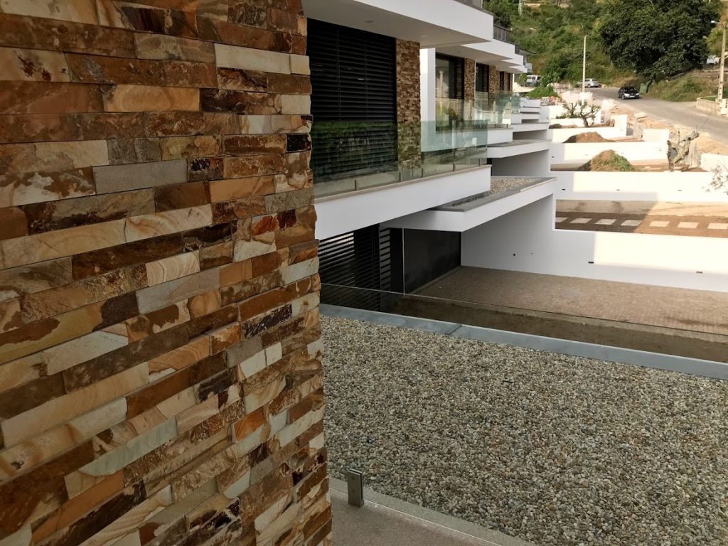 Neste projeto de construção de moradia unifamiliar com uma arquitetura moderna, a Decoralp realizou a aplicação de ETICS (capoto) e assentamento de pedra na fachada exterior assim como a construção dos muros de vedação e a respetiva entrada.